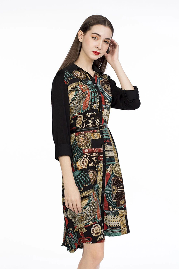 Tuy sử dụng họa tiết với những gam màu đối lập cực kỳ nổi bật, nhưng mẫu đầm KK93-20 lại không hề rối mắt hay khó ứng dụng, nhờ thiết kế sơ mi cài nút thanh lịch, phần tay, cổ áo phối màu cực kỳ hợp lý đặc biệt là phần nhấn xếp ly tinh tế phía sau. Lưu ý, hãy sử dụng chiếc thắt lưng da mảnh đầy cá tính đi kèm để nàng không có cảm giác luộm thuộm hay như bơi trong chiếc đầm này mà còn tạo được vòng eo thon gọn nữa đấy. Nếu như nàng phối hợp item này với những túi xách và giày cao gót đen quyến rũ, chắc chắn nàng sẽ trở thành quý cô sành điệu và thanh lịch trong bất cứ sự kiện nào.